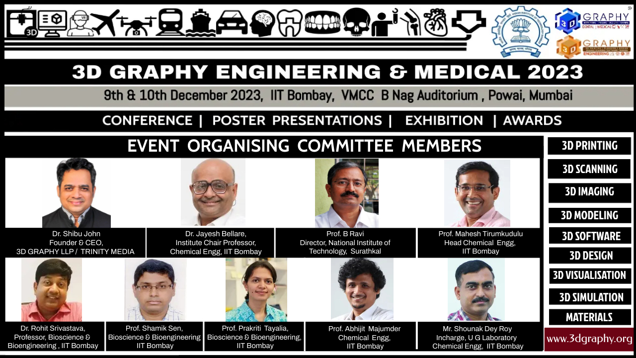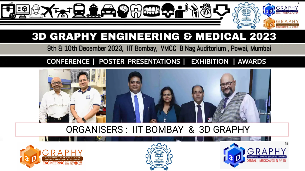 3D GRAPHY ENGINEERING & MEDICAL 2023 - is the 3rd edition of a physical event to be held on 9th & 10th of December 2023 at IIT Bombay, VMCC B Nag Auditorium, Powai, Mumbai, Maharashtra, India. The event is jointly organised by IIT Bombay & 3D Graphy. The event will include conference, exhibition, poster presentations and awards recognising the initiators. 3D Technologies will be the key focus of the event with topics on 3D Printing, 3D Scanning, 3D Simulation, 3D Design (Design for Additive Manufacturing), 3D Visualisation – AR, VR, MR & Material science. We are expected to have 50 plus speakers, 40 plus exhibitors and 1500 plus visitors from all the sectors and specialization attend the event.
