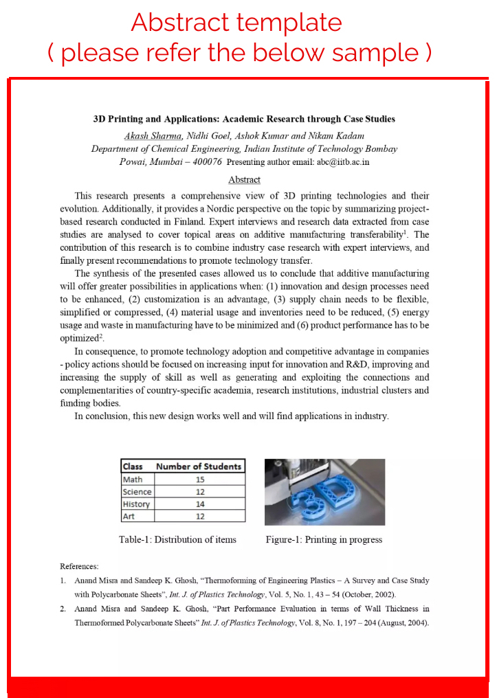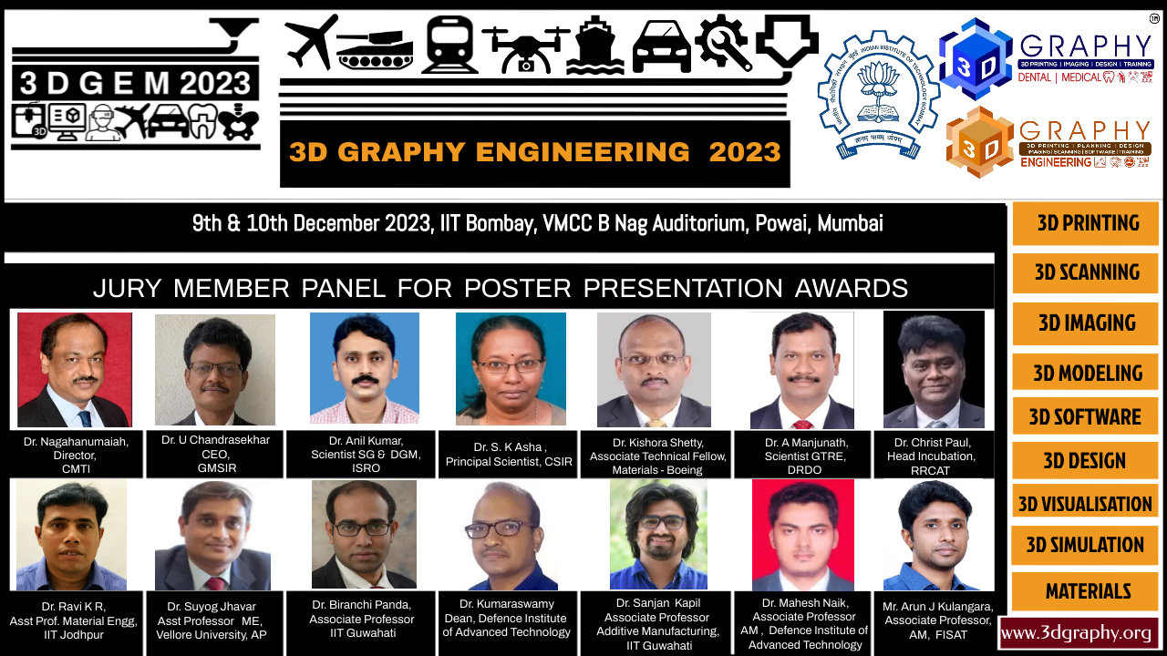 The poster presentation is a formal, research-based presentation of your work. It will provide a visual representation of your research through text, charts, graphs, and other visual aids. The poster presentation will allow viewers to read your research material to interact with you in case of any questions about your methods or your findings. The current findings is to appraise and to acknowledge the efforts made in by the aspirant both students and non-students in 3D technologies which will include 3D Printing, 3D Scanning, 3D Software, 3D Visualisation – AR, VR, MR and also material science which will include filaments, resins, bio-inks, metal, non-metal which are 3d printable for various engineering, industrial, dental and medical applications.