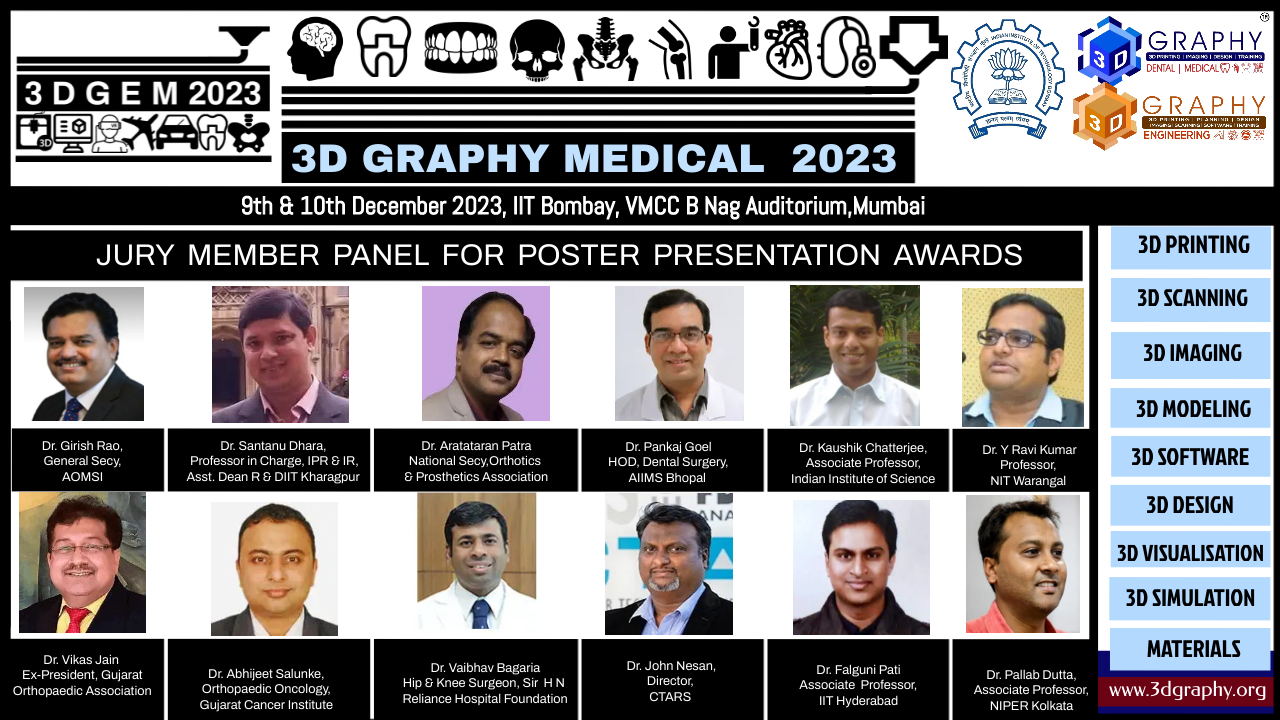 3D Graphy Engineering & Medical ( 3DGEM 2023) invites poster presentations from students from engineering college, Design institute, research institutes, medical college, dental college, hospitals and others. Similarly the poster presentation is also expected by non-students who may be working with manufacturing companies, 3d technology companies, research institutes, consultancy, start-ups, 3d enthusiast and others.
